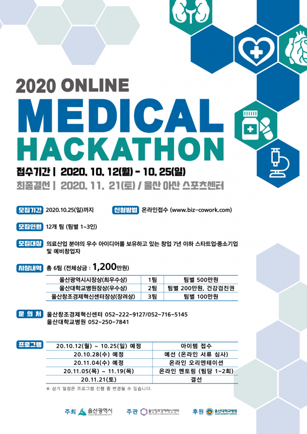 예선은 10월 28일 온라인을 통해 12팀 선발될 예정이며 예선에서 선발된 12팀에게는 울산창조경제혁신센터를 통해 의료·바이오 분야 전문가의 창업교육과 울산대학교병원 의료진의 전문지도가 제공된다.