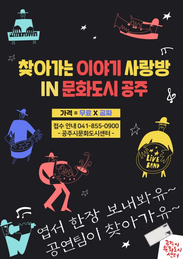 공주시 문화도시센터와 함께 추진하는 이번 사업은 가족과 친구, 반상회, 봉사단, 동아리 등 15인 이하로 구성된 시민모임의 사연을 접수한 뒤 지역 문화예술 공연팀이 직접 찾아가 공연을 펼치는 프로그램이다.