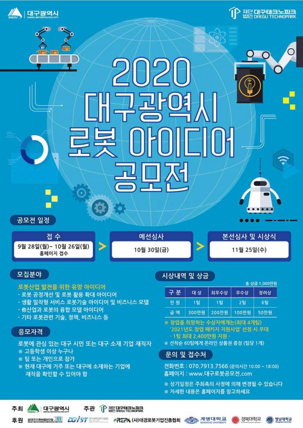 ‘대구 로봇산업 발전을 위한 유망 아이디어’를 주제로 열리는 이번 공모전은 로봇 공정개선 및 활용 확대 생활 밀착형 로봇 이종산업 융합 모델 등 기술중심 아이디어와 더불어 로봇 정책 및 비즈니스 등 다양한 계층에서 참여할 수 있도록 구성했다.