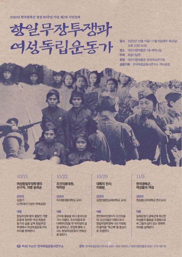 이번 강좌는 조선의용대, 한인애국단, 한국광복군 등 일제강점기에 활동한 여러 무장독립단체들에서 여성들 역시 당당히 전사로서 독립을 위해 싸웠다는 사실을 알아본다.