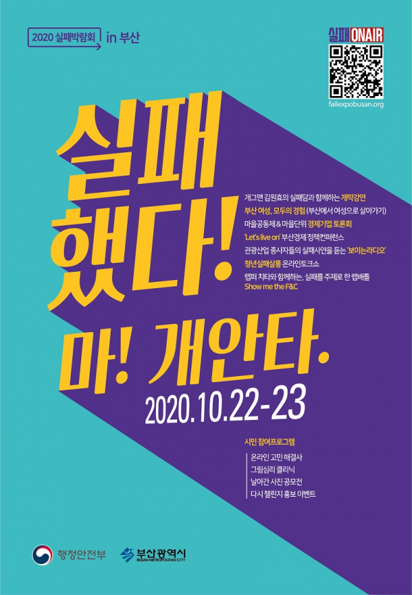 [충청뉴스큐] 부산시는 시민의 다양한 실패 경험을 공유하고 이를 사회적으로 자산화해 재도전을 응원하는 ‘2020 부산 실패박람회’를 22~23일 이틀간 비대면 방식으로 개최한다고 밝혔다.