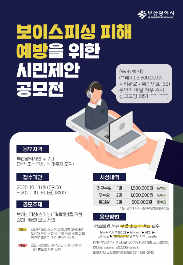 [충청뉴스큐] 부산시가 최근 증가하고 있는 전화금융사기, 일명 ‘보이스피싱’ 피해 예방을 위해 전 시민을 대상으로 시민 제안 공모전을 추진한다고 밝혔다.