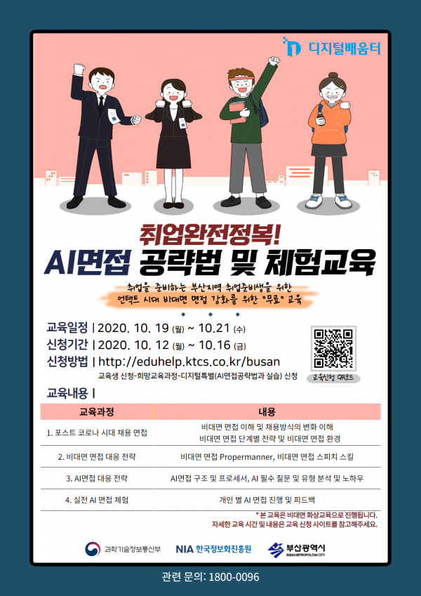 비대면 면접 및 채용방식의 변화를 이해하고 비대면 면접 단계별 전략 및 스피치 스킬, AI필수 질문 및 유형 분석, 답변 노하우, 개인별 AI 면접 진행 및 피드백까지 비대면 면접에 꼭 필요한 내용으로 부산시 디지털배움터의 특별과정으로 교육을 구성했다.
