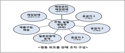 피의자들은 일본인 관광객 호객, 매장 내 고객 응대, 위조품 사입, 위조품 공급 등 역할 분담을 조직적으로 하여 일본인 관광객들에게 고가의 위조품을 판매한 것으로 드러났다. 시 민사경의 압수수색영장 집행 당시 피의자들은 현장에 위조품을 구매하러 들어와있던 일본인 관광객 무리 6명을 일행이라고 주장하며를 외치며) 현장에서 빠져나가기도 했다.