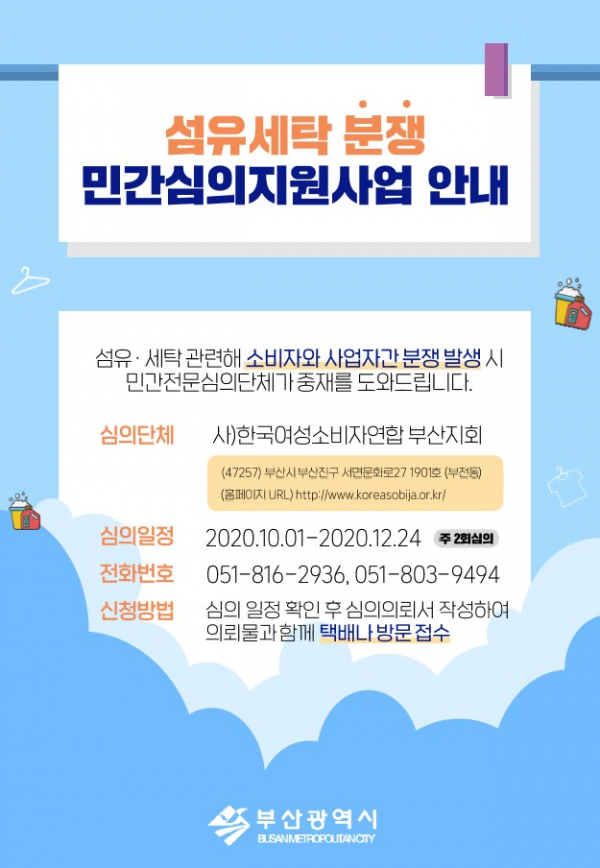 이에 부산시는 사)한국여성소비자연합 부산지회를 통해 섬유·세탁 관련 소비자피해를 적극 중재하고 시민들의 불편을 해소한다는 방침이다.