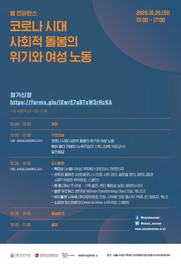서울시여성가족재단이 후아료위원회, WTC, 메트로폴리스와 공동으로 개최하는 이번 국제 웹 컨퍼런스에서는 ‘코로나 시대 사회적 돌봄의 위기와 여성 노동’을 주제로 노동, 돌봄 분야에서 젠더 불평등 상황을 살펴보고 각 도시의 대응 상황을 공유할 예정이다.