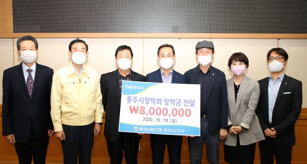 [충청뉴스큐] NH농협은행 충주시지부는 19일 충주시청을 방문해 충주시장학회에 800만원의 장학금을 전달했다.