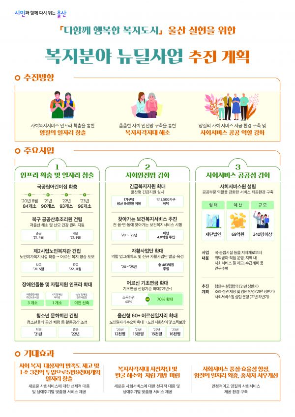 [충청뉴스큐] 울산시가 코로나19에 따른 복지수요 확산과 신종 감염병 대비에 선제적으로 대응하기 위해 ‘다 함께 행복한 복지도시, 울산’ 구현을 목표로 울산형 복지·건강분야 뉴딜 사업을 본격 추진한다.