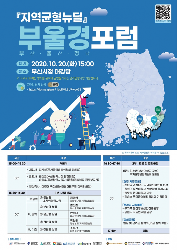 [충청뉴스큐] 부산시는 10월 20일 오후 3시, 부산시청 1층 대강당에서 국가균형발전위원회, 울산광역시, 경상남도와 공동으로 ‘지역균형뉴딜 부울경포럼’을 개최한다고 밝혔다.