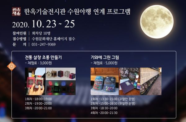 [충청뉴스큐] 오는 23일부터 25일까지 수원화성 일원에서 열리는 ‘수원 문화재 야행’과 연계해 수원시 한옥기술전시관에서 다양한 전통문화 체험 행사를 운영하다.