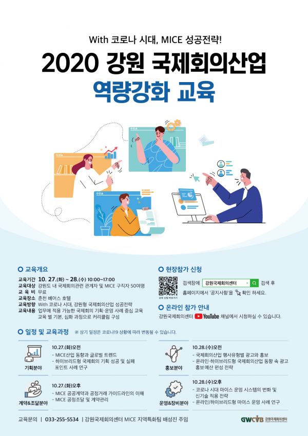 특히 ‘위드코로나 시대, 강원형 국제회의산업 성공전략’으로 교육 방향을 설정하고 기획, 계약 및 조달, 홍보 그리고 운영 및 장비 분야 구성된 이번 교육은 하이브리드형으로 변화하는 마이스 산업의 트렌드와 실무에 적용가능한 운영 사례 중심으로 진행된다.