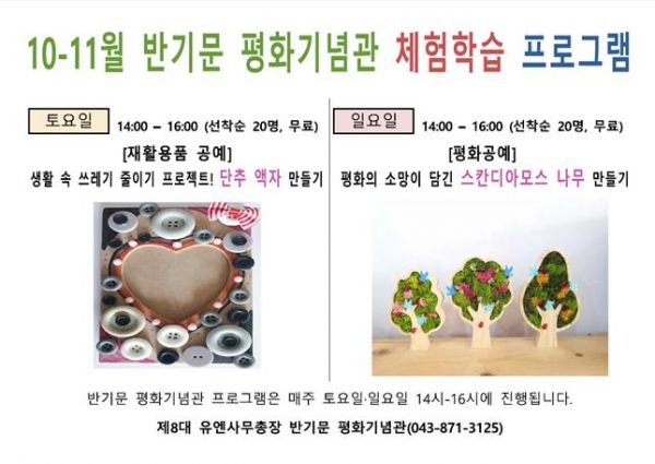운영 프로그램은 오는 11월30일까지 매주 토요일 ‘생활 속 쓰레기 줄이기 프로젝트-단추 액자 만들기’ 일요일 ‘평화의 소망이 담긴 스칸디아모스 나무 만들기’가 오후 2시부터 4시까지 각각 선착순 20명을 대상으로 무료로 진행된다.