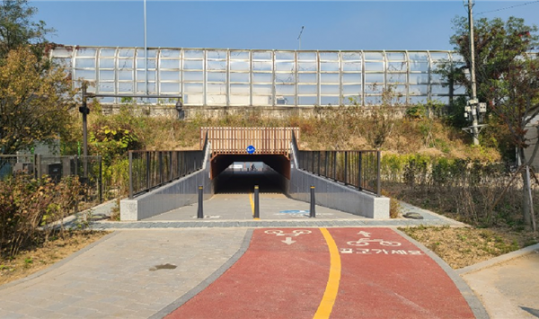 ‘마곡 나들목’ 은 한강 진출입로 앞에 보행자와 자전거의 충돌을 피하기 위해 날개벽 형상 설계를 도입, 안전을 강화했다.