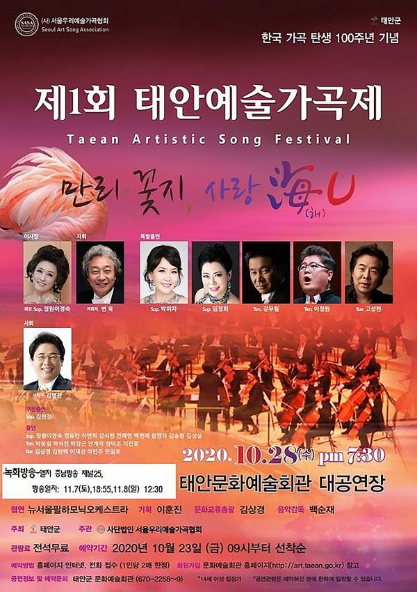 ‘만리·꽃지 사랑해유’라는 부제로 개최되는 이번 ‘태안 예술가곡제’는 김병찬 전 케이비에스 아나운서의 사회로 지휘자 변욱·뉴서울필하모닉오케스트라가 호흡을 맞추며 한국 성악계를 대표하는 성악가와 ‘서울우리예술가곡협회’ 전속 성악가들의 합동 콘서트로 꾸며진다.