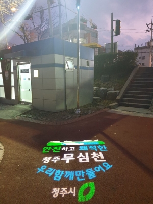 [충청뉴스큐] 청주시가 도심하천인 무심천 산책로에 야간 보행 불안감 해소를 위해 ‘밤길 안심 로고젝터’를 설치했다.