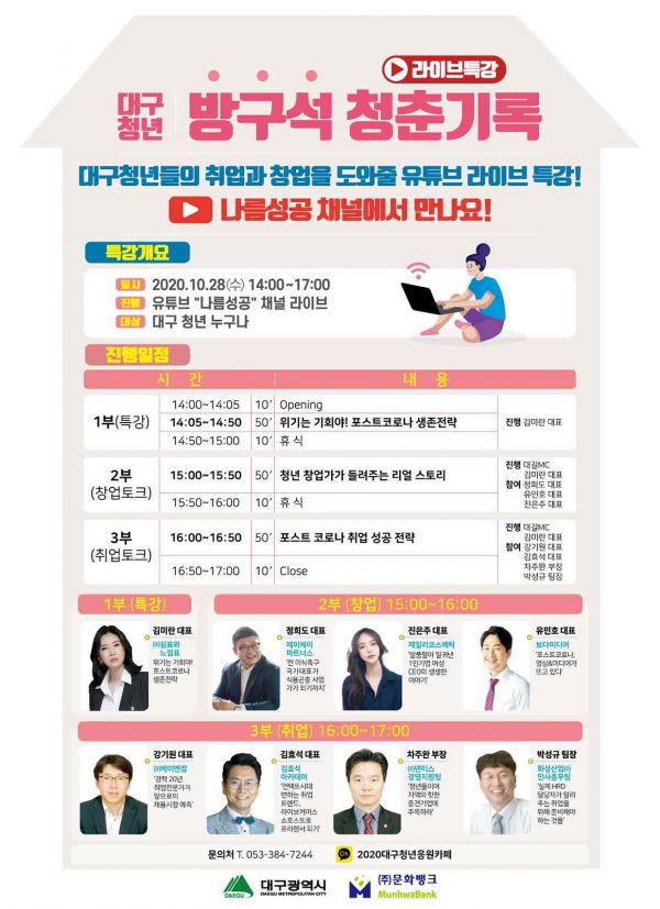 [충청뉴스큐] 대구시와 ㈜문화뱅크는 코로나19로 취업에 어려움을 겪고있는 지역 청년들의 취·창업 지원을 위해 ‘대구청년 방구석 청춘기록 라이브 특강’을 진행한다.