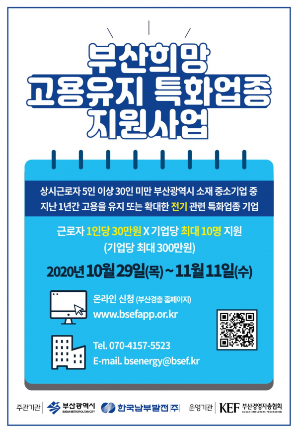 사업지원 대상은 상시근로자 5인 이상 30인 미만 부산 소재 전기 관련 업종의 중소기업 중 1년 이상 고용유지 또는 고용을 확대한 기업으로 기업당 최대 300만원을 지원할 예정이다.