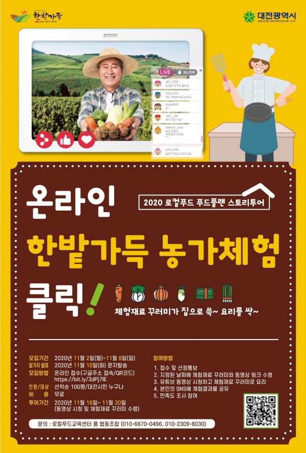 [충청뉴스큐] 대전시는 지역 내 코로나 19 확진자가 지속적으로 발생함에 따라 로컬푸드·푸드플랜 스토리 투어를 비대면으로 운영하기로 하고 다음달 2일부터 8일까지 참여 신청을 접수한다고 29일 밝혔다.