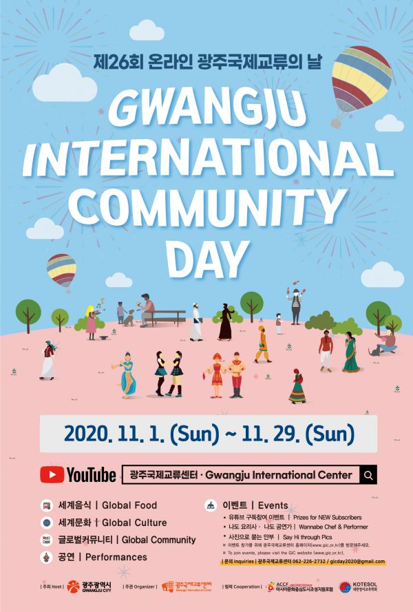 [충청뉴스큐] 세계 각국의 음식과 전통문화, 이국적인 공연 등이 어우러져 광주 시민과 외국인이 함께 하는 글로벌 문화축제인 ‘제26회 광주국제교류의 날’이 오는 11월1일부터 29일까지 온라인으로 개최된다.