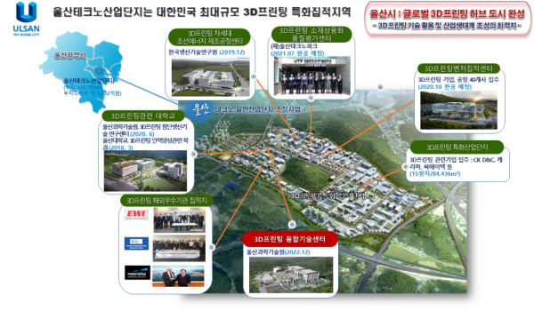 울산시는 주력산업을 고도화하기 위해 지난 2015년 12월 지역전략산업으로 3디프린팅 산업을 선정하고 3디프린팅산업의 기반구축을 위해 3디프린팅 제조공정센터, 3디프린팅 벤처집적 지식산업센터 등 2개의 센터를 건립했다.