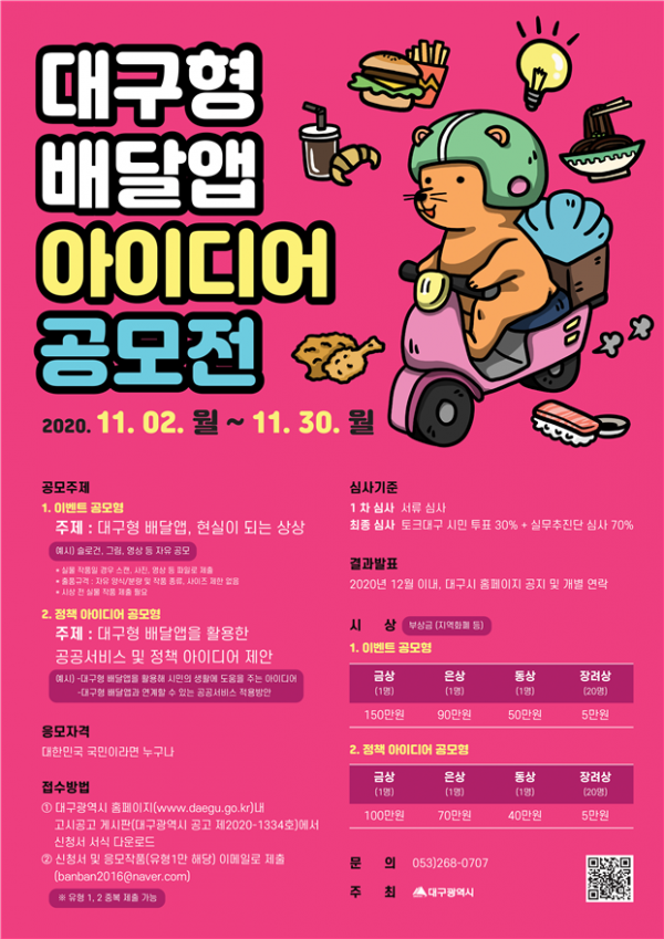 ‘대구 배달앱, 현실이 되는 상상 제안’을 주제로 펼쳐지는 이번 공모전은 이벤트 공모형-내가 원하는, 내가 상상하는 배달앱의 모습을 슬로건, 그림, 영상 등 자유로운 형식으로 제안, 정책아이디어 공모형-대구 배달앱을 활용한 공공서비스 및 정책아이디어 제안의 두 가지 유형으로 진행된다.