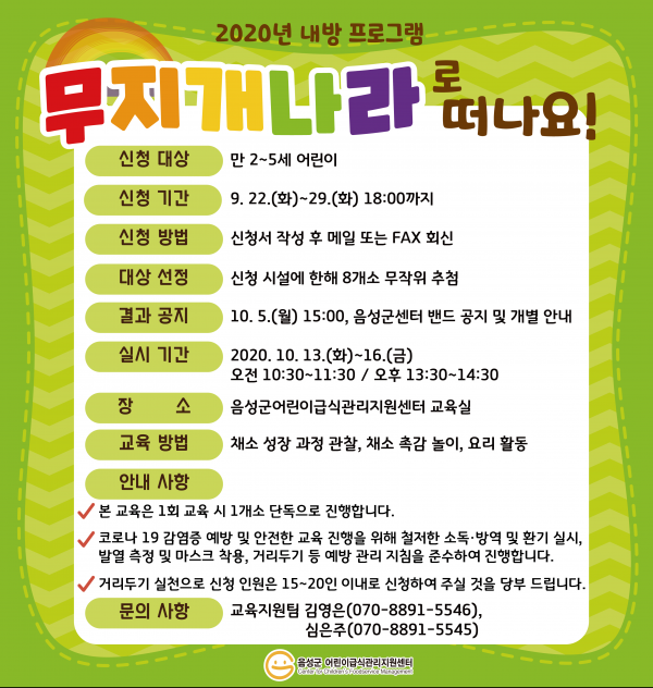 [충청뉴스큐] 음성군어린이급식관리지원센터가 관내 어린이급식소 16개소을 대상으로 센터 내방프로그램 ‘무지개 나라로 떠나요’, ‘무지개 채소와 놀아요’ 교육을 2차로 나누어 진행했다.