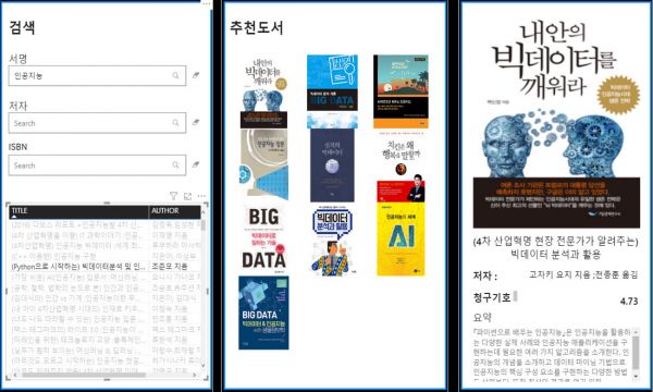 대구디지털산업진흥원 빅데이터활용센터에서 240만 건의 대출이력, 도서관가입자정보, 도서정보 등을 수집해 빅데이터 분석모델을 만들고 실무부서에서 쉽게 활용할 수 있도록 추천서비스까지 구현했다.