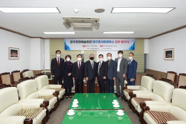 [충청뉴스큐] 대구콘서트하우스와 광주문화예술회관은 지난 2일 오후 5시 30분 광주문화예술회관에서 국내외 문화예술 발전과 시민 문화향유기회 확대를 위해 상호 협력해 나가고자 업무협약을 체결했다.