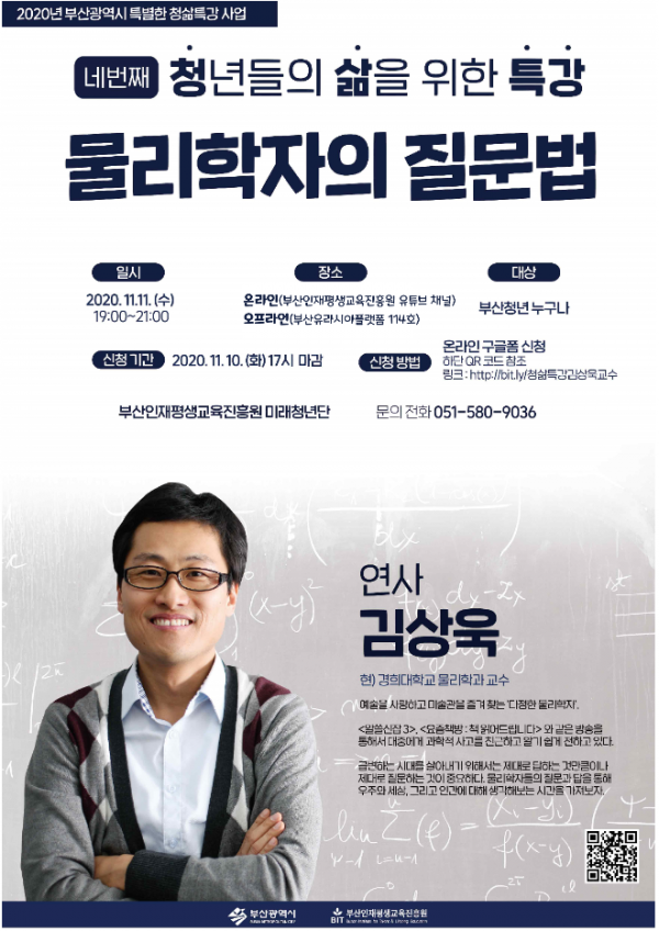 부산 청년들과 ‘물리학자의 질문법’이라는 주제로 물리학자들의 질문과 답을 통해 우주와 세상, 그리고 인간에 대해 생각해보는 시간을 가질 예정이며 부산 청년이면서 ‘몽땅몰타’ 저자인 장수빈 작가가 사회자로 참여한다.