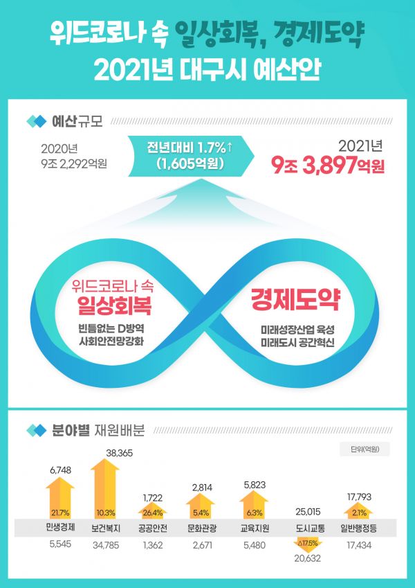 [충청뉴스큐] 대구시는 2021년도 예산안으로 전년 대비 1.7% 증가한 9조 3,897억원을 편성했다.