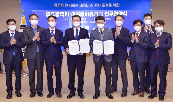 [충청뉴스큐] 광주광역시는 10일 오전 시청 비즈니스룸에서 인공지능 유치기업인 ㈜이글루시큐리티와 광주형 인공지능 비즈니스 기반 조성을 위한 51번째 업무협약을 체결하고 법인설립 및 지역사무소 설립을 통해 광주 인공지능 사이버 보안 산업 육성에 적극 협력키로 했다.