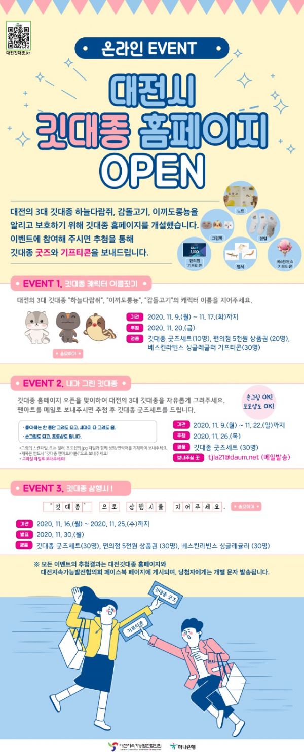 이번 행사는 코로나로 인해 야외활동이 어려운 상황에서 비대면 활동으로 시민들에게 대전의 생태계를 대표하는 야생생물인 깃대종을 홍보 프로그램과 접목시켜 자연생태에 대한 보전 인식을 높이기 위해 운영된다.