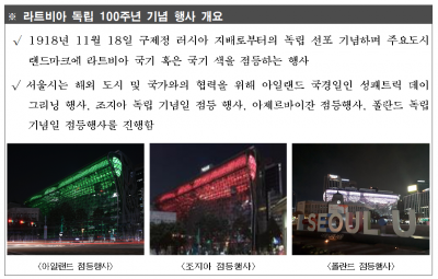 라트비아 독립 100주년 기념행사는 라트비아가 1차 세계대전 종식 후 라트비아 공화국 독립을 선포한 날로부터 100년이 되는 날을 기념하기 위한 것으로서 서울 시청사를 라트비아 국기색으로 불을 밝힐 예정이다.