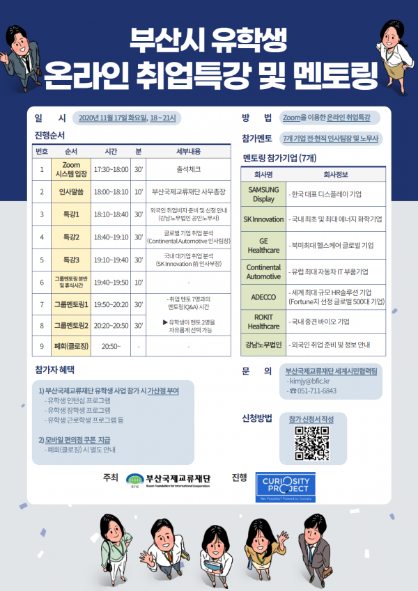 [충청뉴스큐] 부산시와 부산국제교류재단이하 재단)은 오는 17일 오후 6시부터 9시까지 비영리 재단법인 큐리아서티 프로젝트팀과 함께 하는 ‘부산시 유학생 온라인 취업특강&멘토링’을 개최한다고 밝혔다.