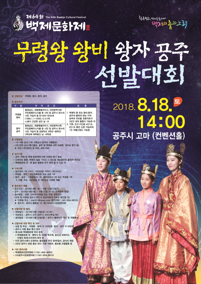모집대상은 충남, 세종, 대전지역에 주민등록을 둔 사람이나 온누리 공주시민 가입자이면서 왕, 왕비, 왕자, 공주의 품위에 걸맞은 지적 능력과 외모를 갖춘 사람으로서 2년 간 백제문화제 홍보 등의 분야에서 대외 할동이 가능해야 한다.