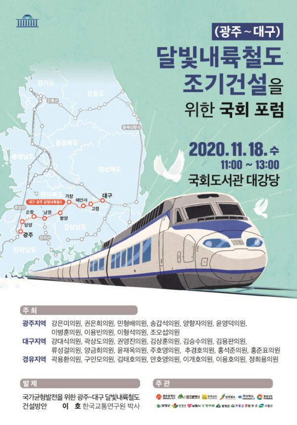[충청뉴스큐] 달빛내륙철도 조기건설을 위한 국회포럼이 오는 18일 국회도서관 대강당에서 열린다.