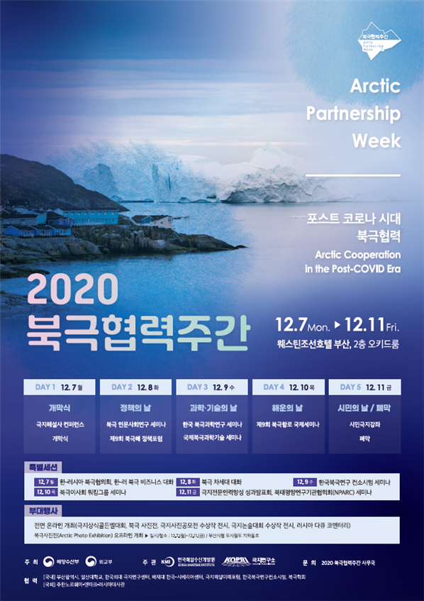 [충청뉴스큐] 부산시는 2020 북극협력주간이 오는 12월 7일부터 11일까지 5일간, 부산 웨스틴조선호텔에서 열린다고 밝혔다.
