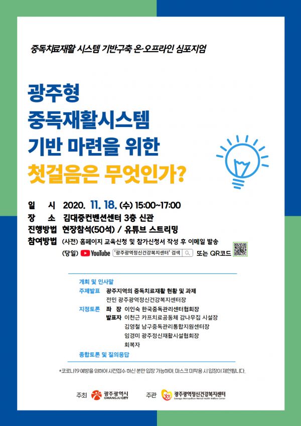 이번 심포지엄은 음주폐해 예방의달 11월을 맞아 중독질환자 회복 및 연속적 치료재활을 위한 광주시 재활서비스 전달체계 구축 방향성 논의를 위한 것으로 유튜브로 실시간 동시 생중계된다.