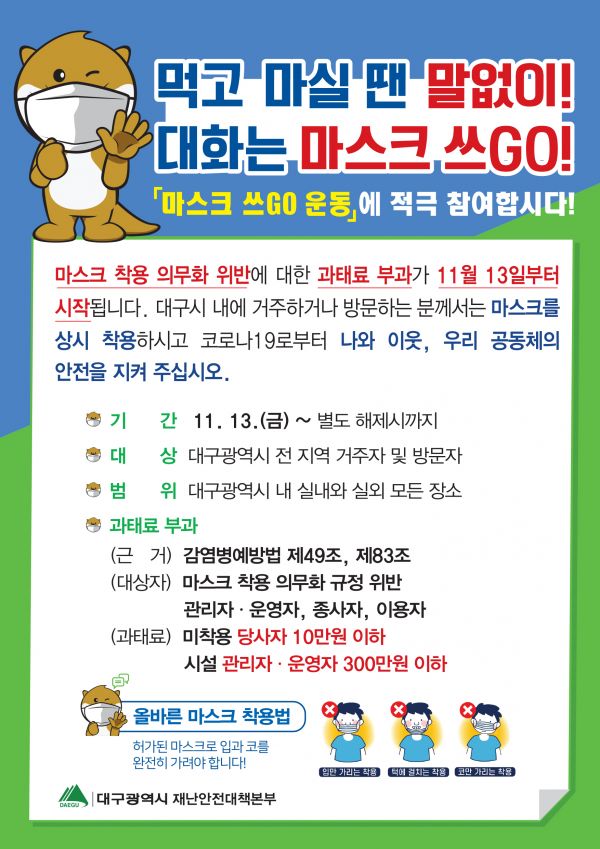 또한, 대구시는 수도권 단계 격상 이전인 11월 13일부터 “먹고 마실 땐 말없이, 대화할 땐 마스크 쓰고” 하자는 ‘마스크 쓰GO’ 운동을 시민대표 200여명으로 구성된 ‘코로나19 극복 대구광역시 범시민대책위원회’와 함께 시민문화운동으로 전개하고 있다.