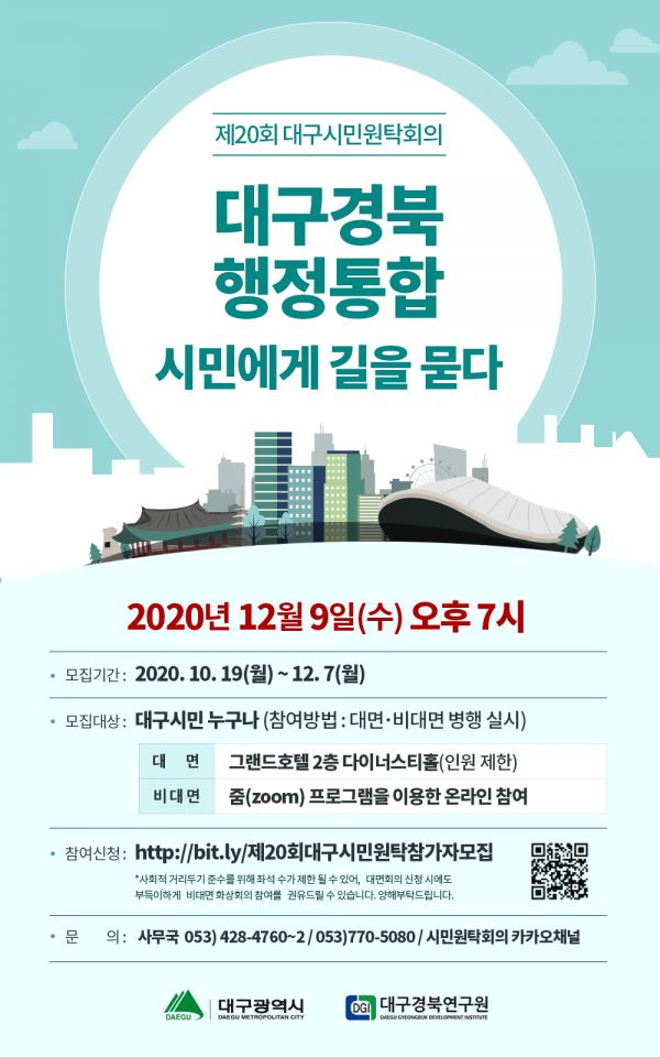 [충청뉴스큐] 대구시는 오는 12월 9일 오후 7시 그랜드호텔에서 ‘대구경북 행정통합, 시민에게 길을 묻다’라는 주제로 제20회 대구시민원탁회의를 개최한다.