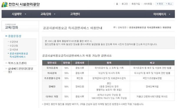 이번 서비스 시행으로 이용요금 감면 혜택을 받는 이용자들은 천안시시설관리공단 통합예약사이트를 통해 공공시설 예약 시 개인정보이용 동의만 하면 즉시 이용요금을 감면받을 수 있다.