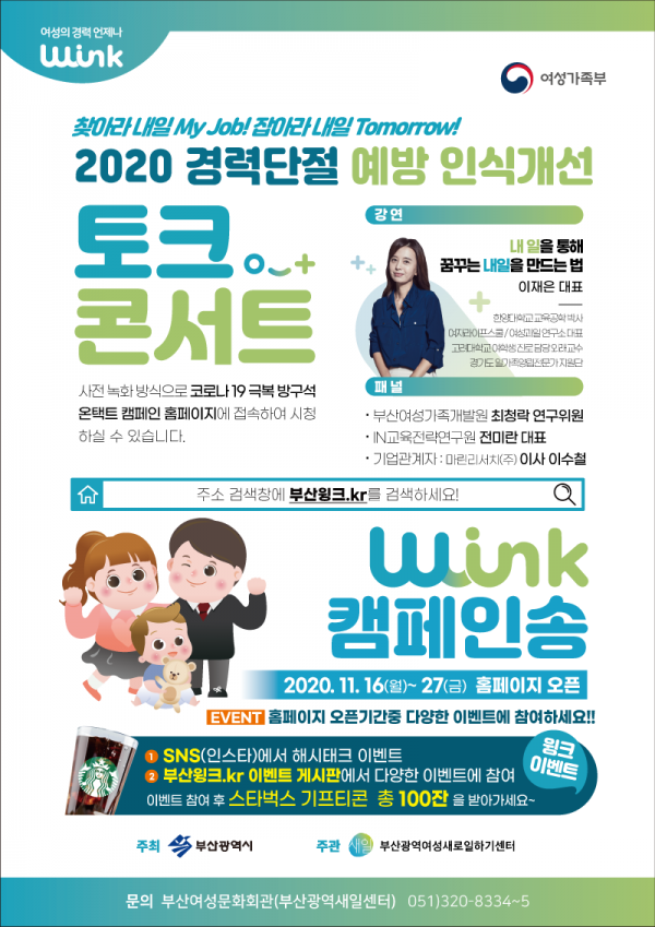 관심 있는 시민 누구나 11월 27일까지 해당 온라인 플랫폼에 접속해 토크콘서트 영상을 시청할 수 있으며 시청 후기 작성 이벤트, 경력단절 예방 인식개선 퀴즈 풀기 ‘도전 가로세로 퀴즈’ 등 홈페이지 이벤트 게시판을 활용한 이벤트와 사회관계망서비스 ‘인스타그램’를 활용한 해시태그 이벤트에 참여할 수 있다.