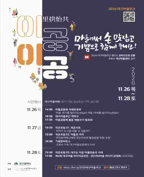 [충청뉴스큐] 대구시는 오는 26일부터 28일까지 3일 동안 올해 마을공동체 활동을 마무리하면서 그간의 활동 성과와 앞으로 나아가야 할 방향을 공유하기 위해 ‘2020 대구 마을주간’ 행사를 전면 온라인으로 개최한다.