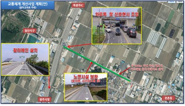 이에 광주시는 원활한 교통소통과 교통안전을 위해 빛고을대로에서 본촌방면 우회 전차로 노면 유도 색깔을 설치하고 용두교차로에서 본촌방면 노후 차선 재정비 및 차로 폭 재조정, 도로와 주변 경작지 단차구간 노면 시설 설치 등 1㎞ 구간에 대해 교차로 교통체계를 개선할 계획이라고 전했다.