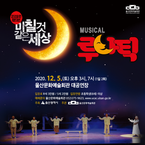 [충청뉴스큐] 울산문화예술회관은 오는 12월 5일 오후 3시, 7시 2회에 걸쳐 문화예술회관 대공연장에서 힐링코미디 뮤지컬 ‘루나틱’ 공연을 선보인다.