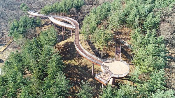 무궁화수목원 상단부에 조성한 성주산 숲 하늘길 걷기 체험시설은 총 연장 174m에 평균 높이 10m의 보도교로 설치했다.