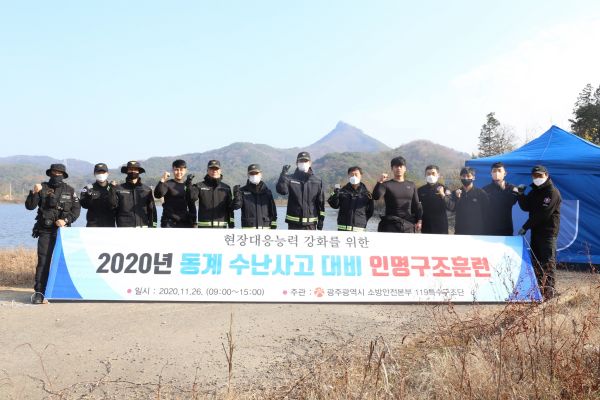 [충청뉴스큐] 광주광역시 소방안전본부는 26일 광산구 왕동에 위치한 왕동저수지에서 신속한 인명구조와 구조능력 향상을 위한 동계 수난 인명구조훈련을 실시했다.