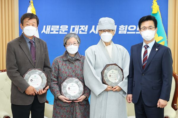[충청뉴스큐] 허태정 대전시장은 26일 오후 3시 시청 응접실에서 ‘제32회 대전광역시 문화상’ 수상자로 선정된 문학부문 양애경, 시각예술 부문 황용식, 공연예술 부문 송재섭 씨를 시상하고 그동안의 노고를 격려했다.