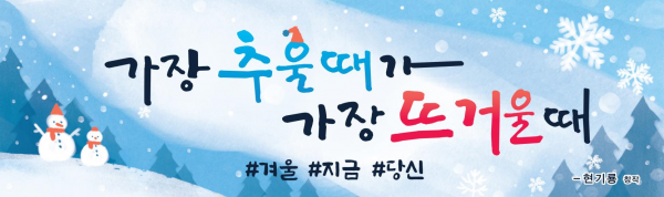 [충청뉴스큐] 부산시는 현기룡 씨의 창작 문안인 ‘가장 추울 때가 가장 뜨거울 때 #겨울 #지금 #당신’을 ‘부산문화글판 겨울편’ 문안으로 선정하고 12월부터 내년 2월 말까지 부산시청사 외벽에 게시한다고 밝혔다.