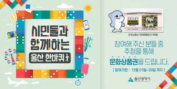 [충청뉴스큐] 울산시는 12월 1일부터 오는 20일까지 20일간 울산을 상징하는 문양과 색채를 홍보하기 위해 ‘시민과 함께하는 공공디자인, 울산 한 바퀴’ 프로그램을 진행한다고 밝혔다.